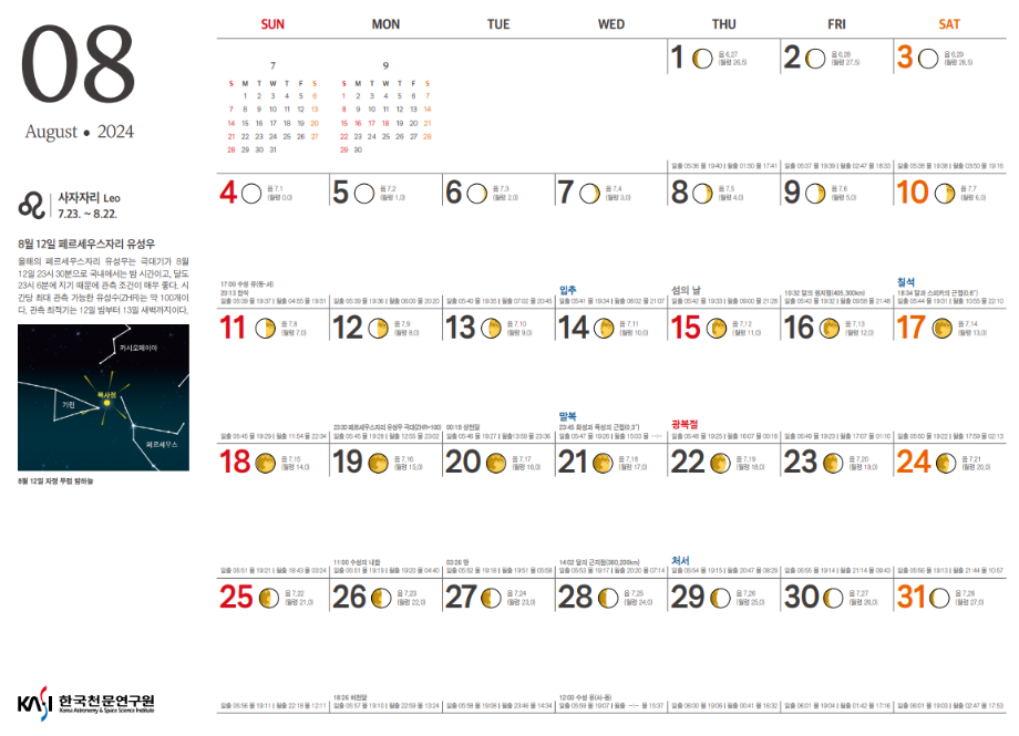 2024년 8월 천체관측대상과 천체현상입니다.